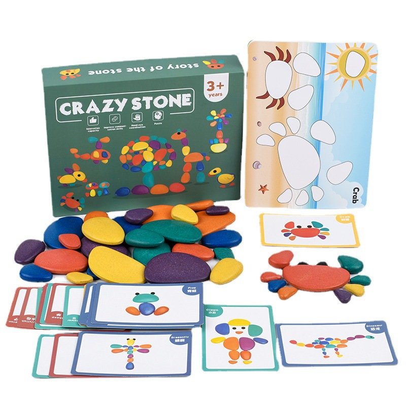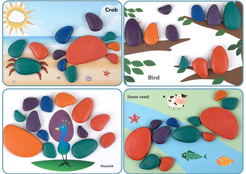 Este juguete está diseñado para estimular el desarrollo cognitivo temprano en los niños. Gracias a las piedras de diferentes formas y colores, los pequeños podrán explorar su imaginación y crear incontables figuras mientras aprenden.